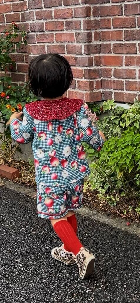 爽やかなリンゴ柄と深みのある赤い手編みのカラーが、お子さまの愛らしさを引き立て、写真映えもばっちりです。