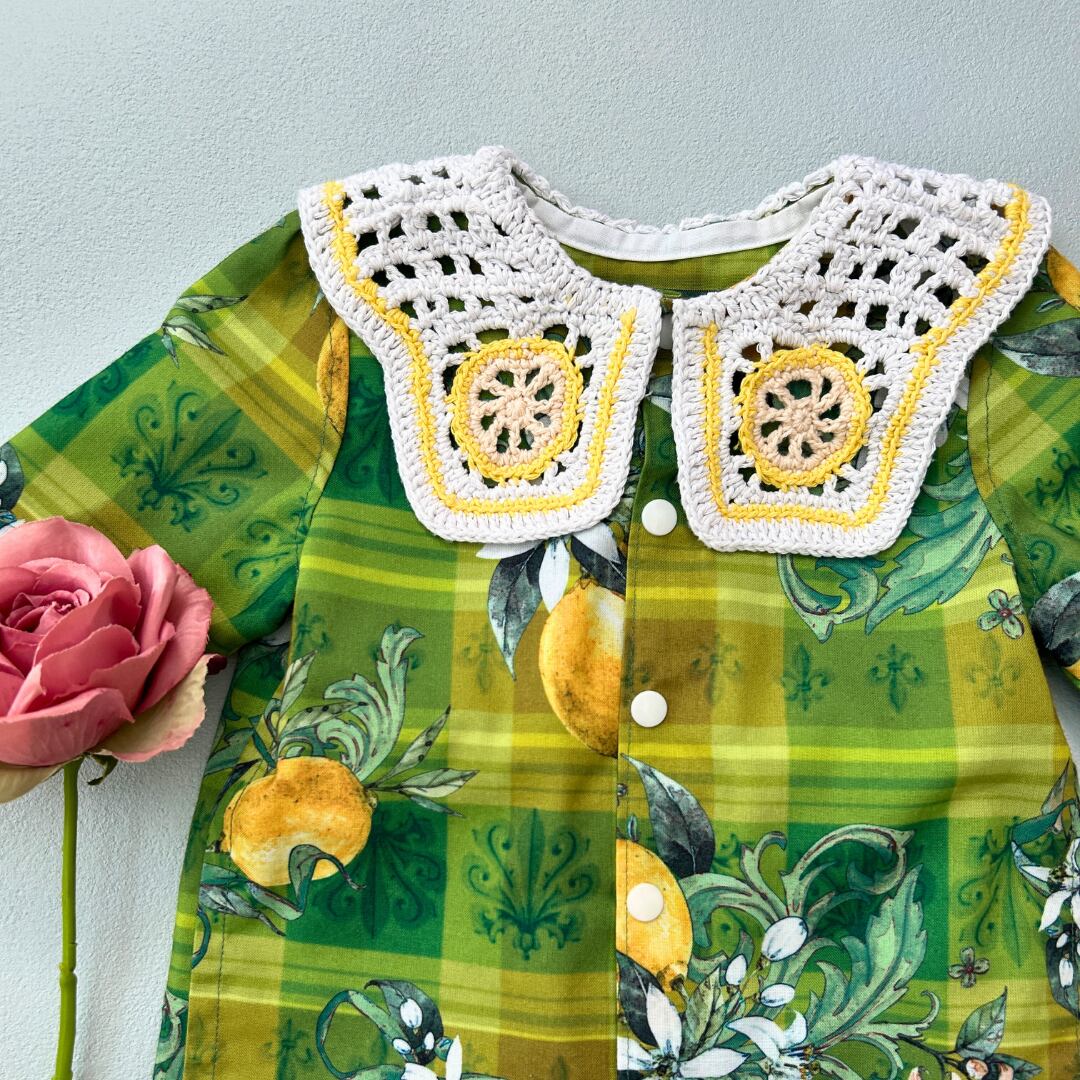 爽やかなレモン柄と、こだわりの手編みの襟が、特別な日を彩ります。